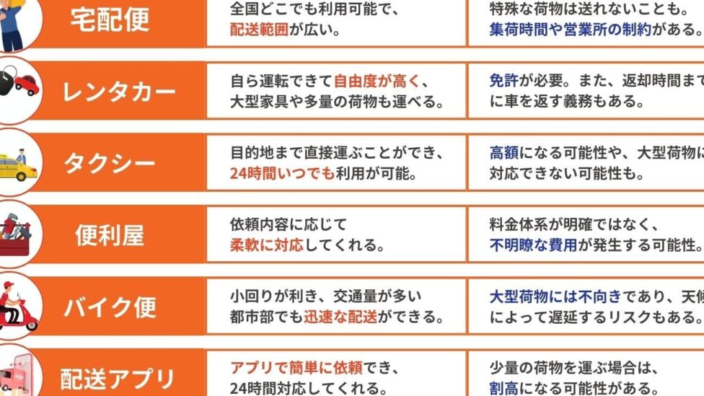 - 配送日時の選択:特に引越しなど、急ぎの配送が必要な場合は、余裕を持った予約を心がける。時間帯を指定できる業者も多いので、利便性を高めます。