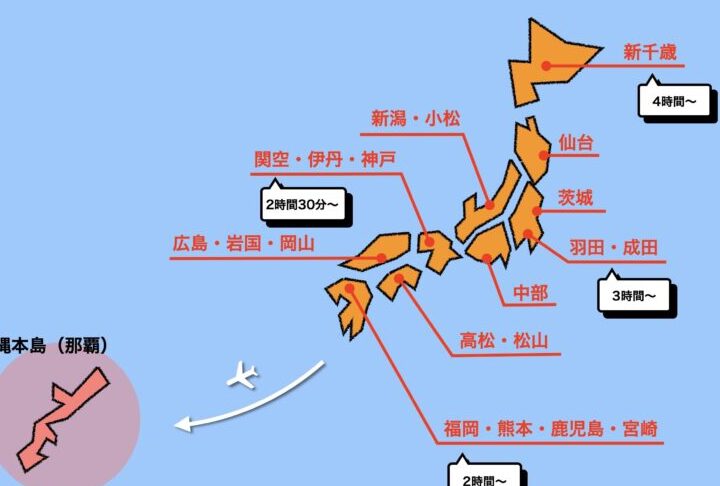 - フライト時間: 東京から沖縄まで約2時間半、大阪からは約1時間半。