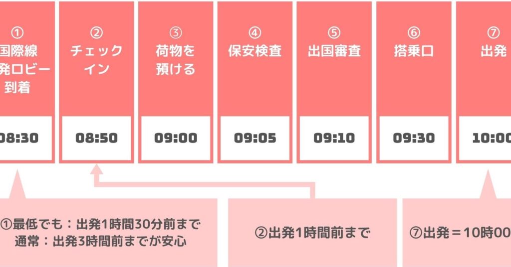 - 低コストキャリア(LCC): 出発の2時間前以上を推奨する場合が多い。