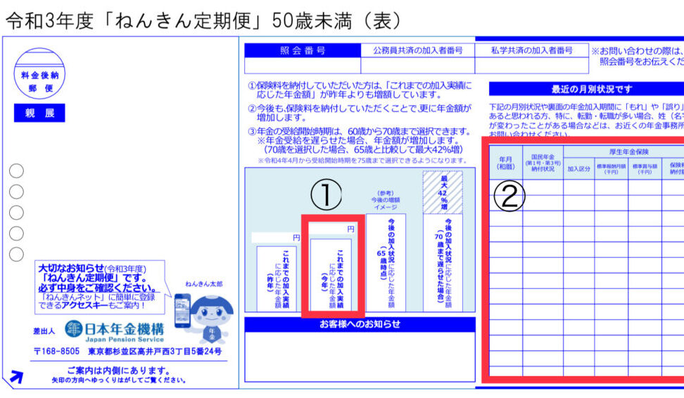 年金定期便は、年金制度に関する詳細な情報を提供する年次の文書です。この文書には、以下のような情報が含まれています: