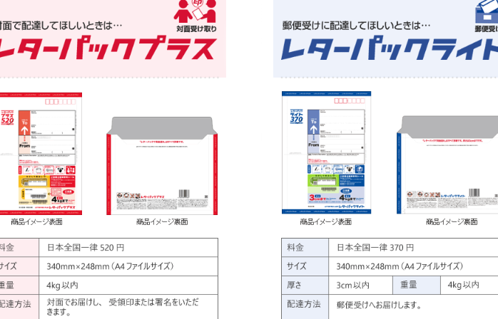 | レターパックプラス | 4kgまで | 520円 | 対面受渡し、受取証明取得可能 |