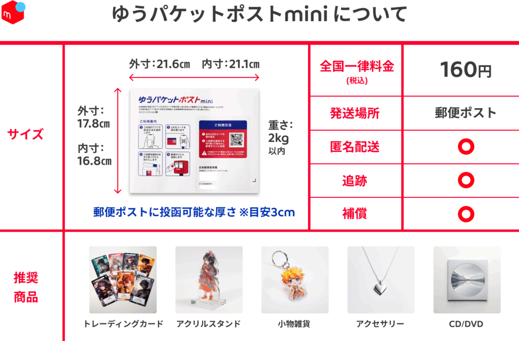 - 郵便局:郵便サービスの一環として、ゆうゆうメルカリ便 ミニを取り扱っています。