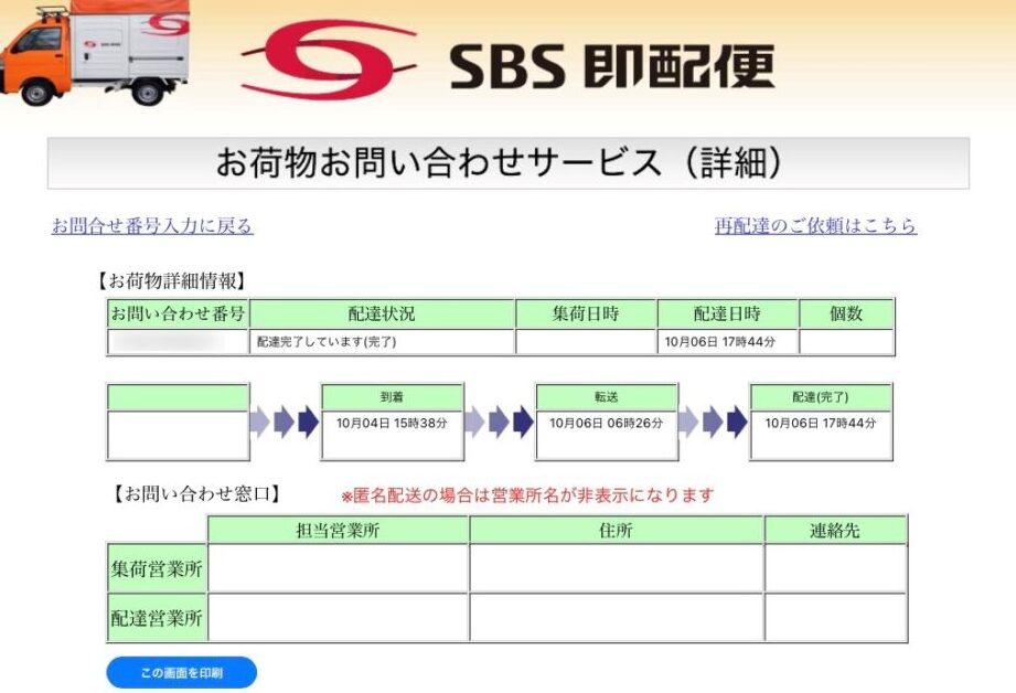 <SBS即配便の通常の配送日数は、地域に依存しますが、一般的に翌日配達が基本です。場合によっては、当日配送も選択できます。>