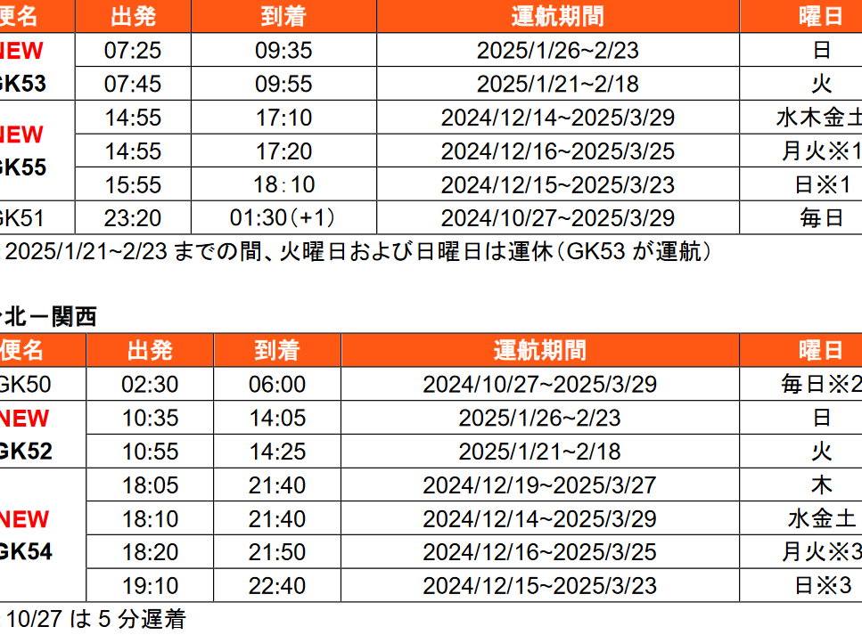 これらの運航本数は曜日や季節によって変動します。また、一部路線では早朝や深夜のフライトも提供されており、利用者にとって便利です。出発前には最新の時刻表を確認することをお勧めします。