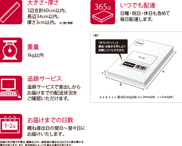 定型外郵便は、特にサイズや重量が基準を超える荷物に適したサービスです。一般的に、重量は4キログラムまでとなっています。配送の日数は、地域によって異なりますが、通常1日から4日で届けられます。追跡サービスはないものの、料金が安価で、全国どこでも利用できるため、多くの人に好まれています。