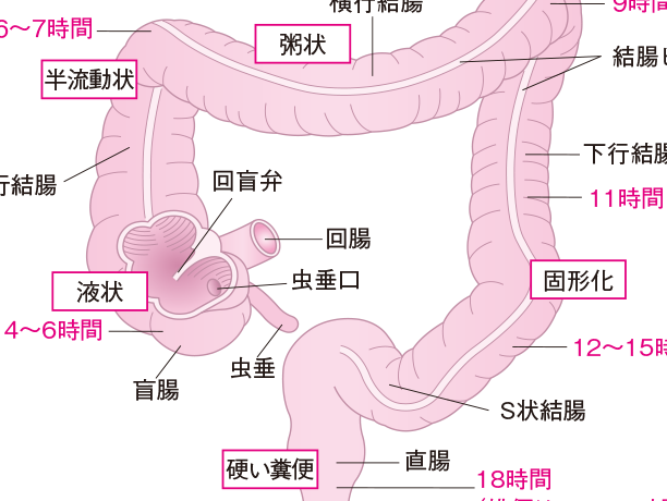 - 水分の吸収: 大腸が水分を吸収し、便を固形にする。