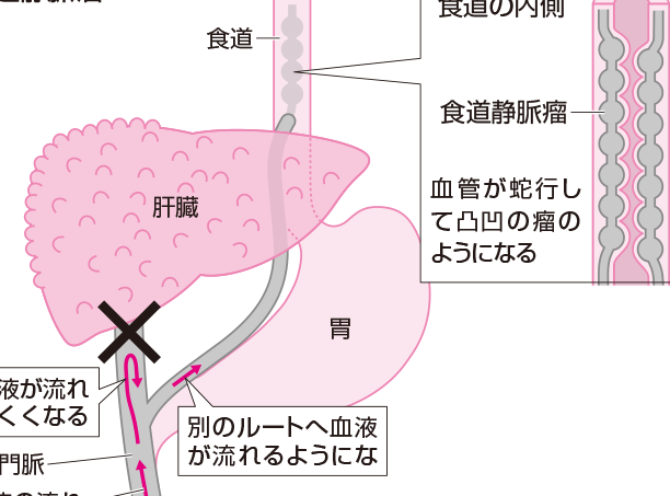 - 食道静脈瘤: 肝臓の血流が妨げられ、静脈が圧迫され膨張します。