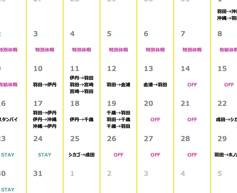 - 通常期:閑散期には便数が減少し、その結果として一日の担当便も減ります。しかし、この時期にも安全管理やサービス向上への取り組みは続けられます。
