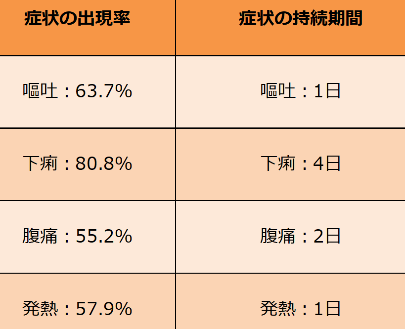これらの症状は通常24時間から48時間続くことが多いですが、個人差があります。感染した場合、十分な水分補給が必要です。