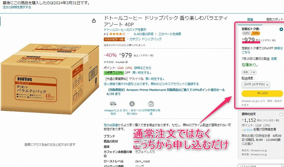 - 定期便オプションを選択: 商品の注文ボタン付近にある「定期便を選択」のオプションをクリックします。